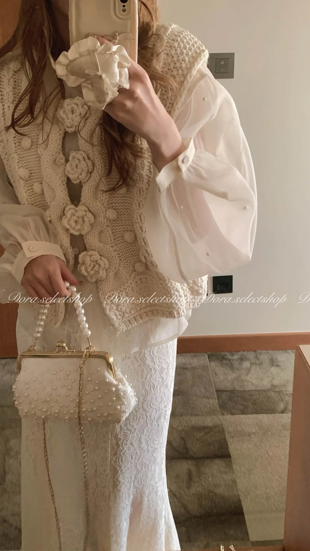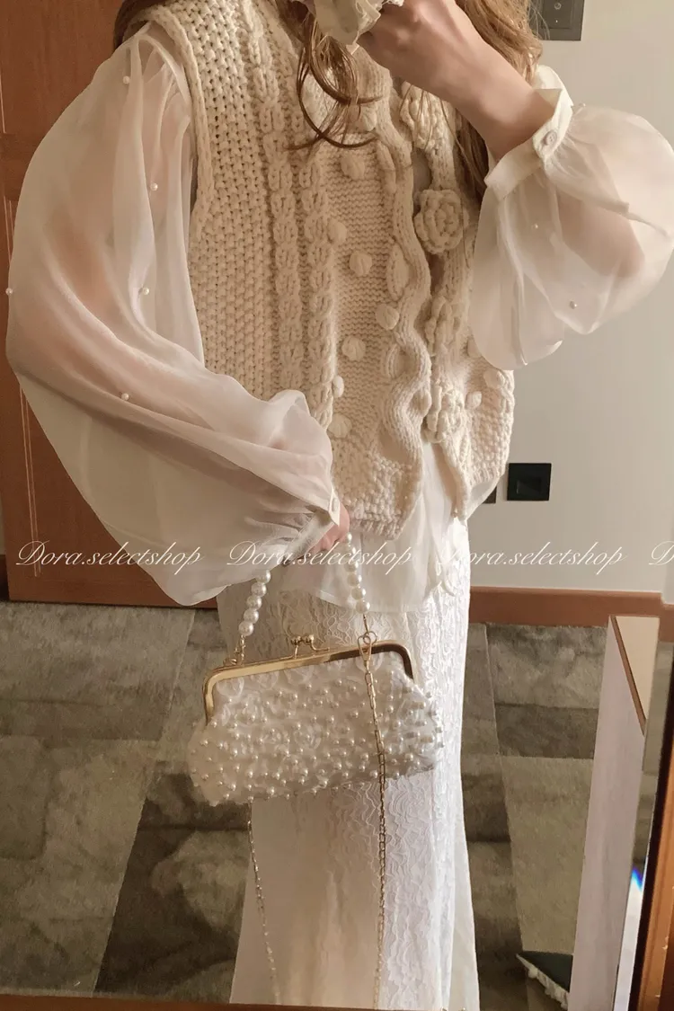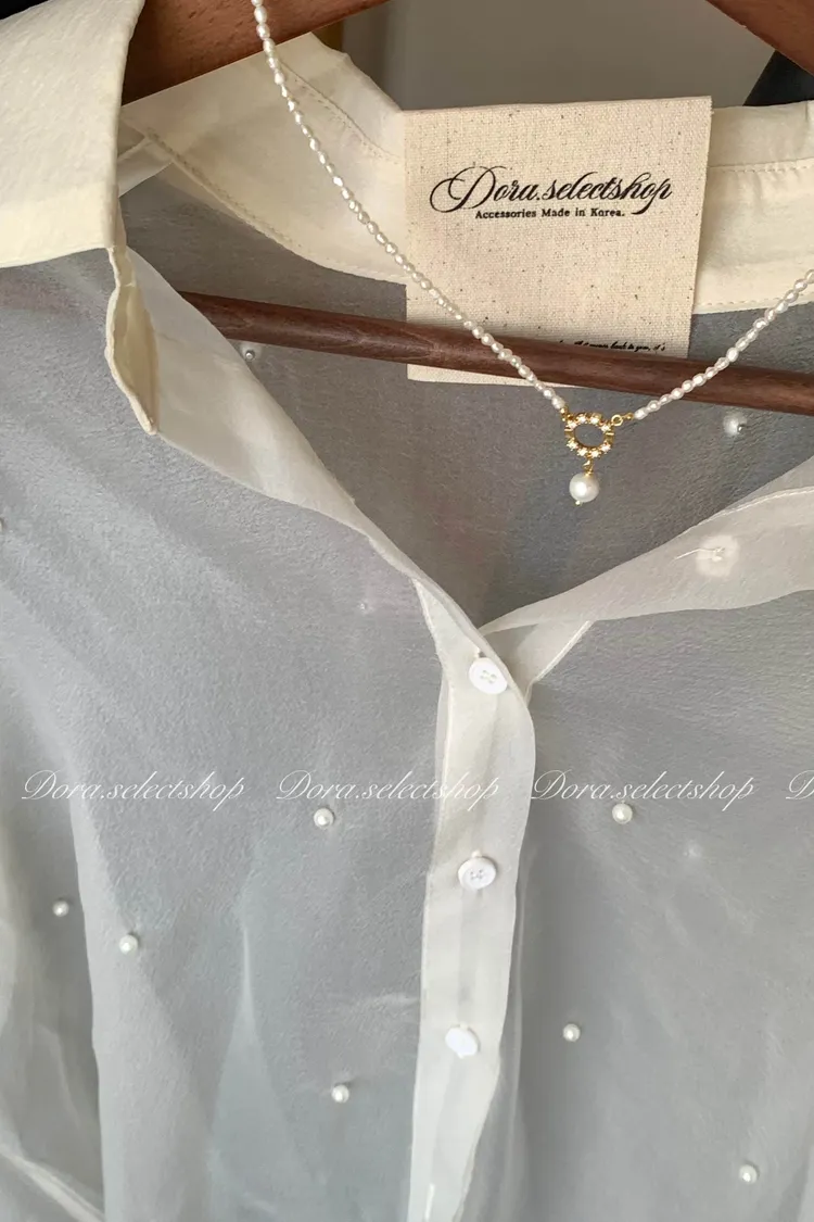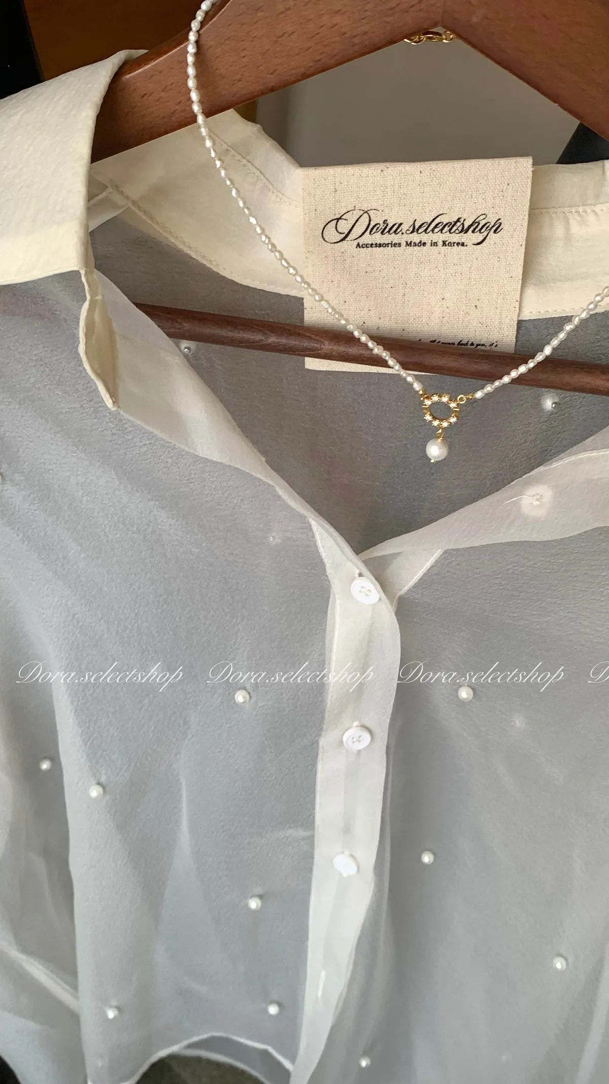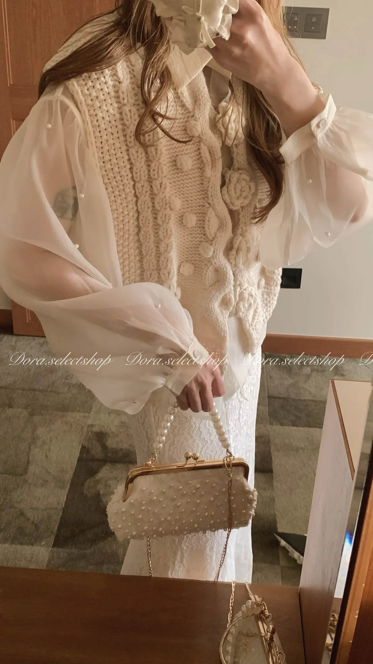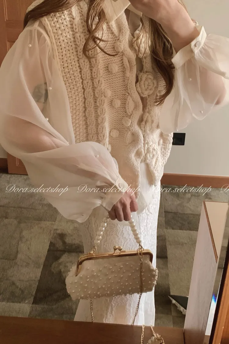 復古仙氣珍珠透肌澎袖襯衫---米白