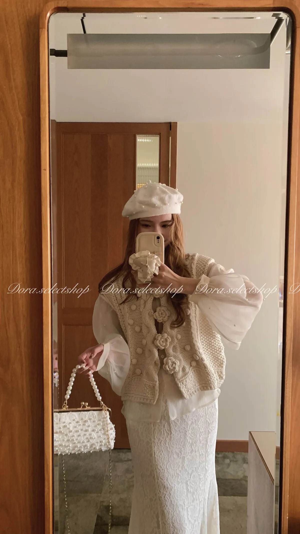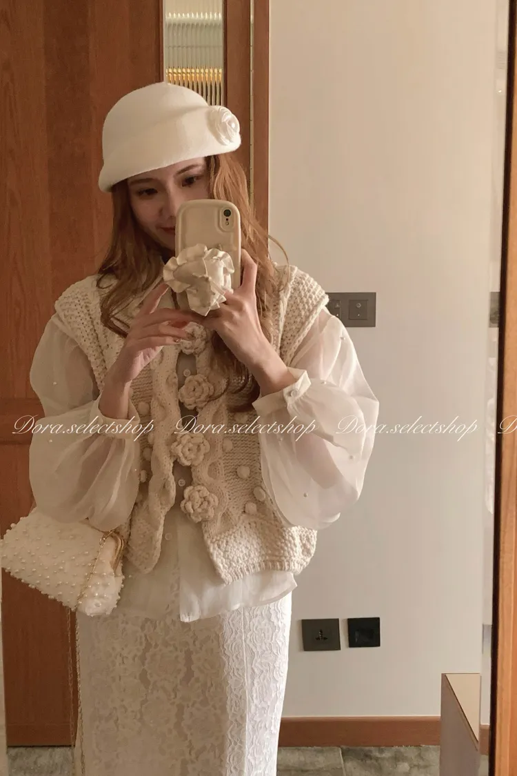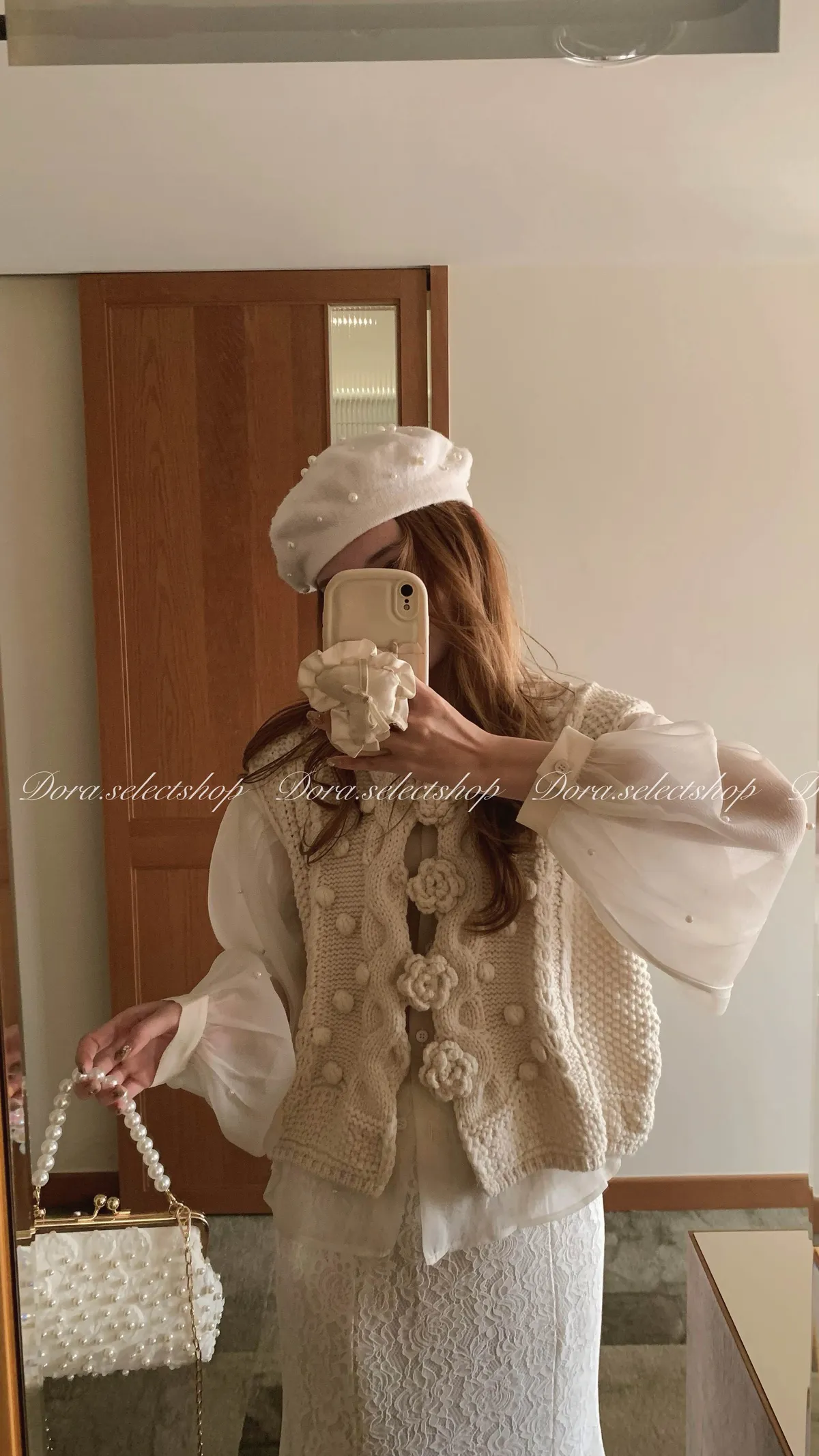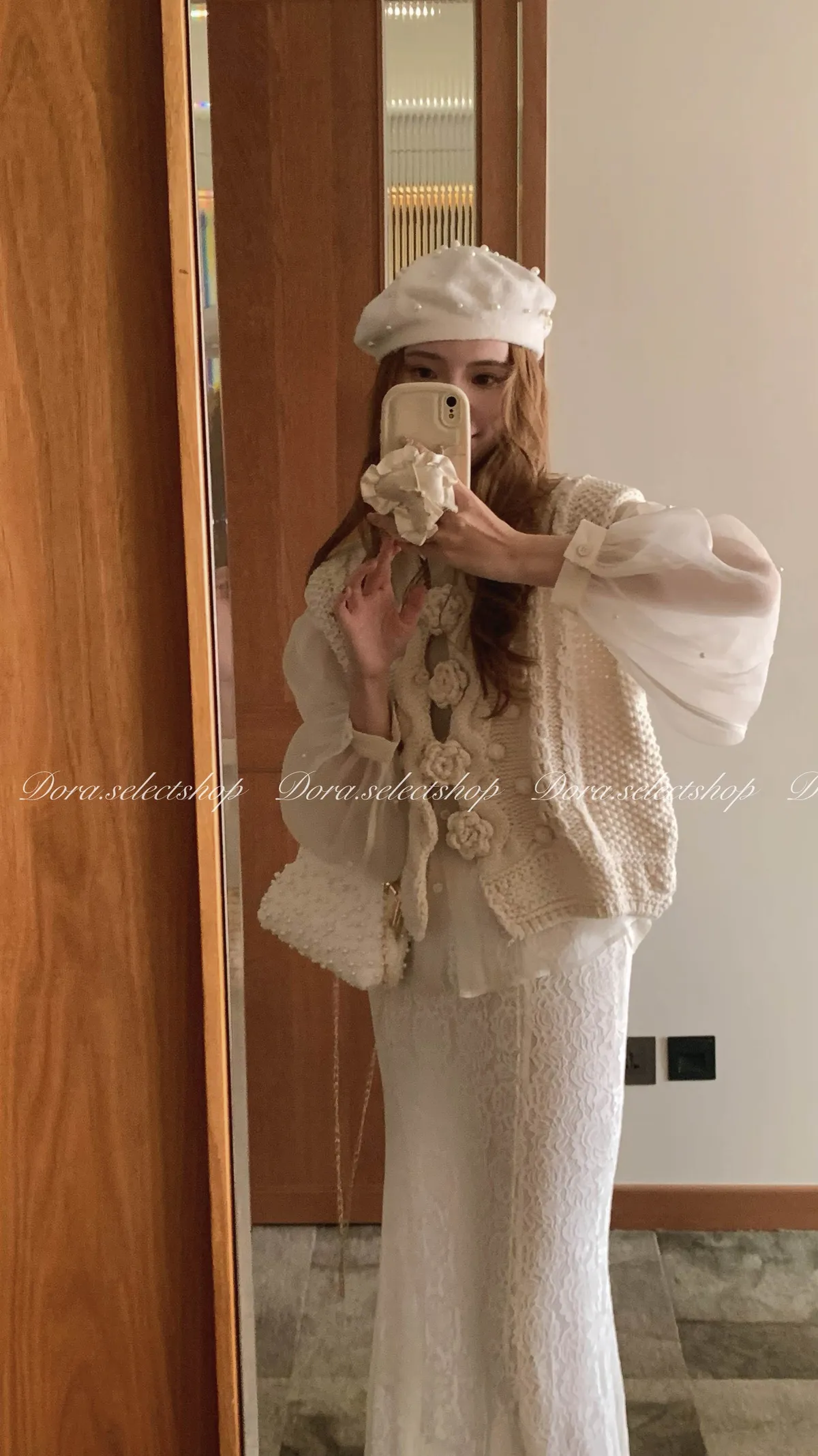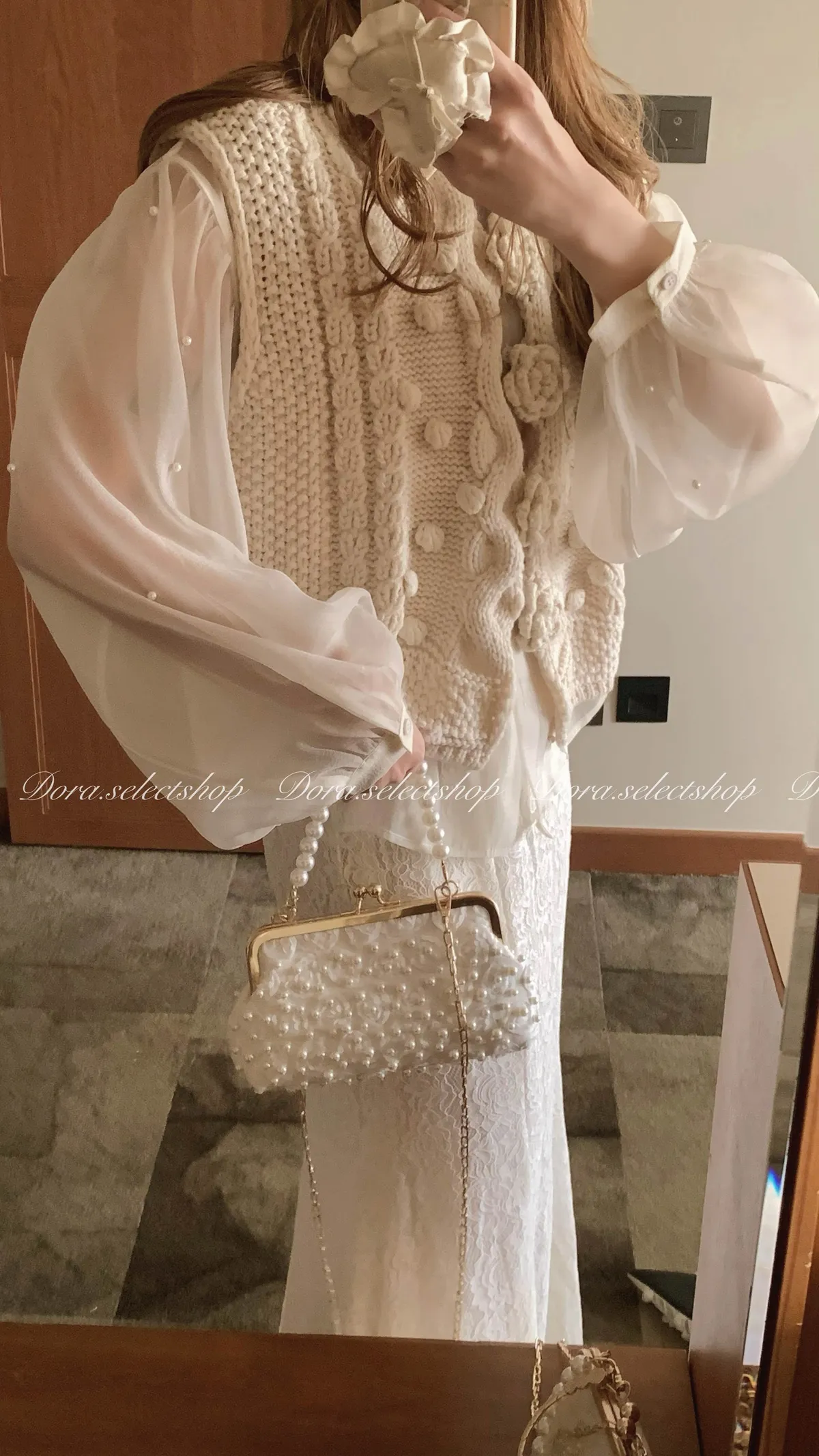復古仙氣珍珠透肌澎袖襯衫---米白