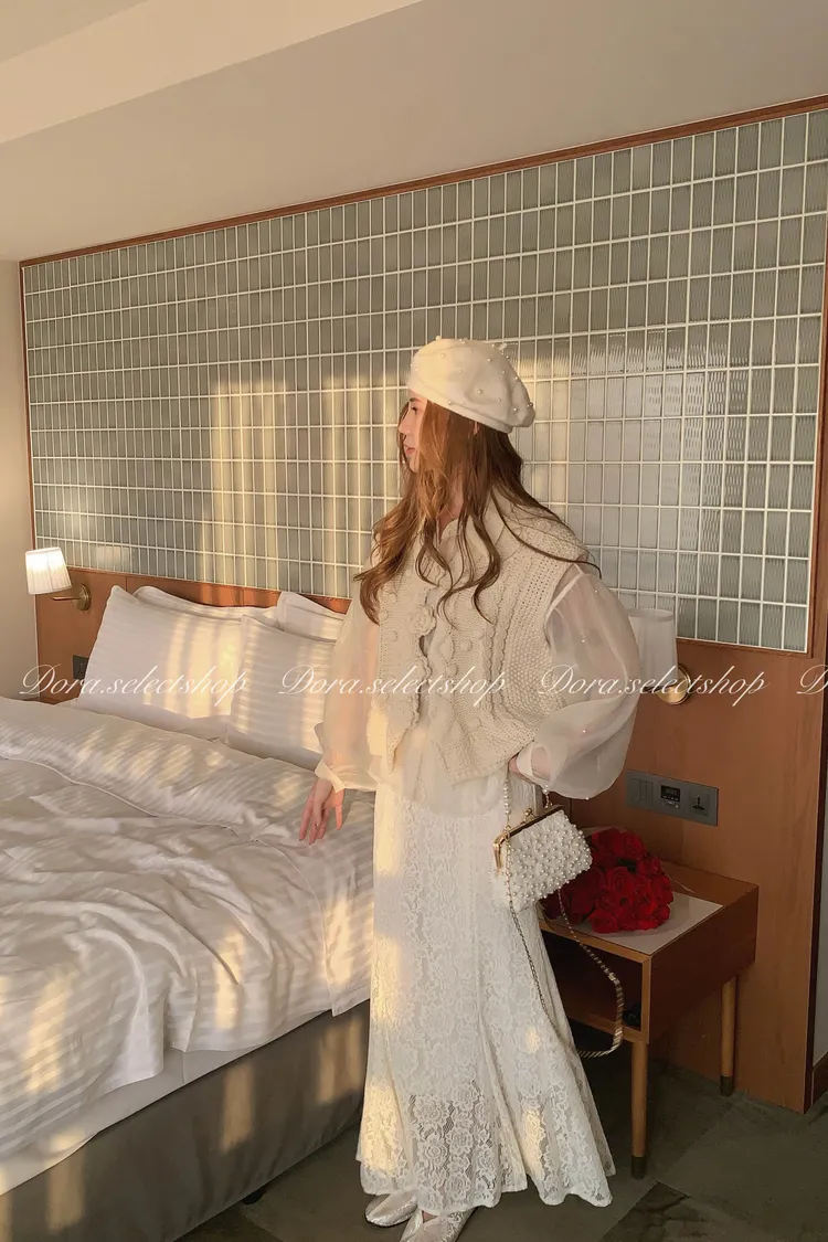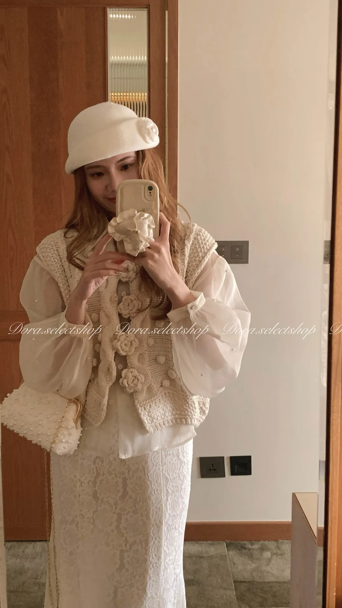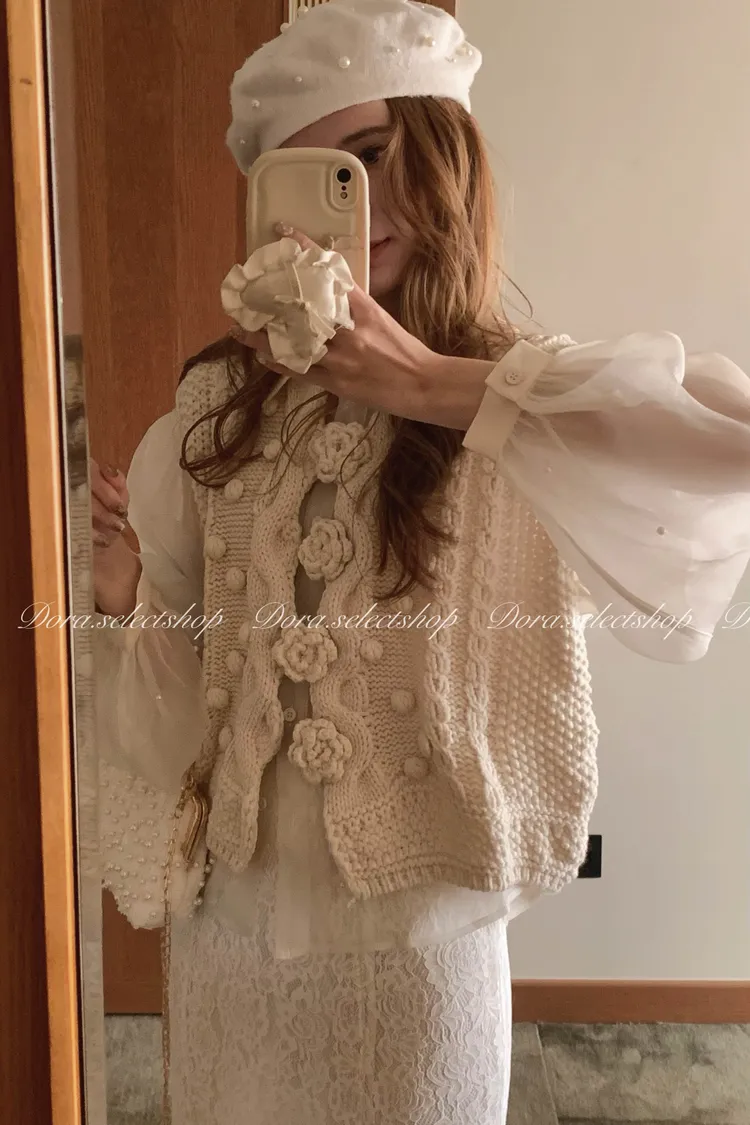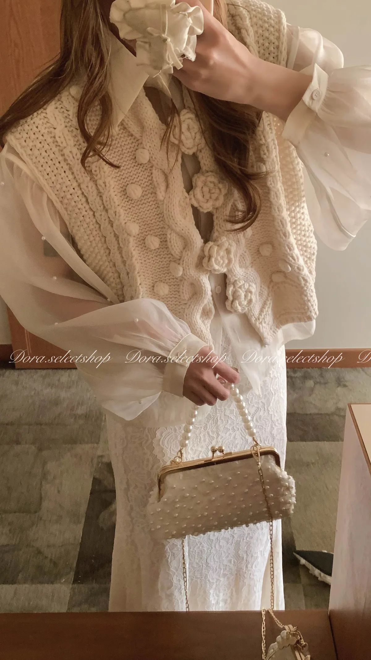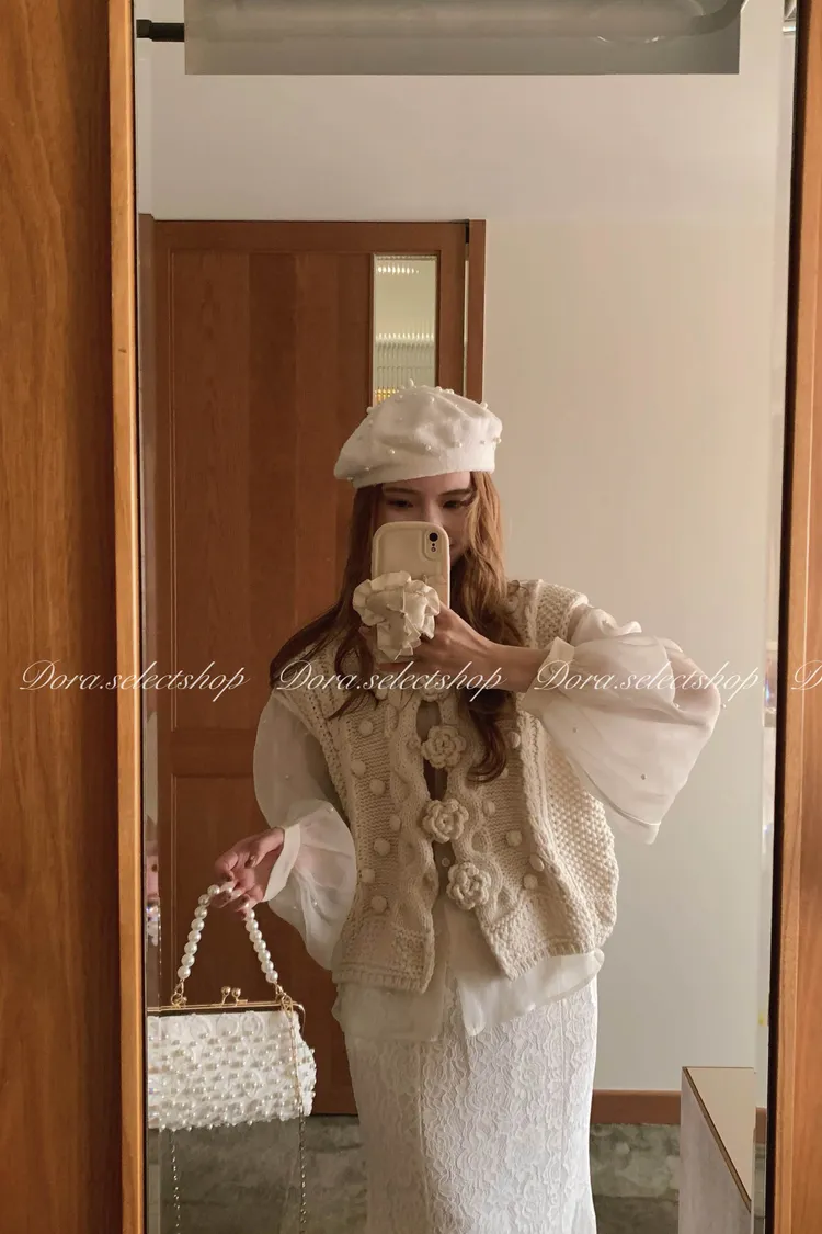 復古仙氣珍珠透肌澎袖襯衫---米白