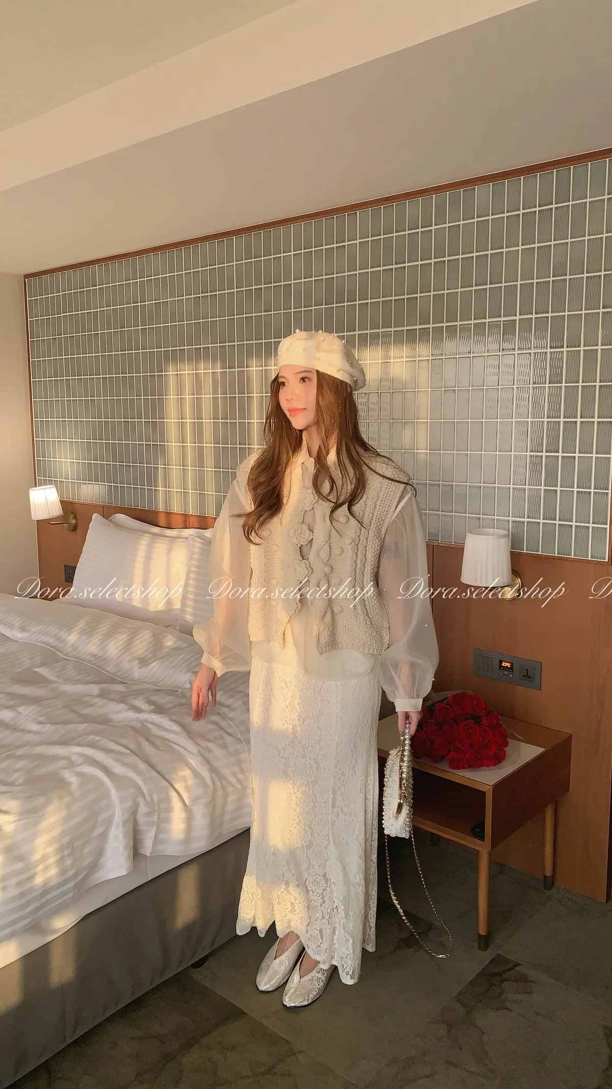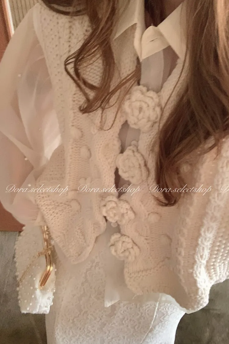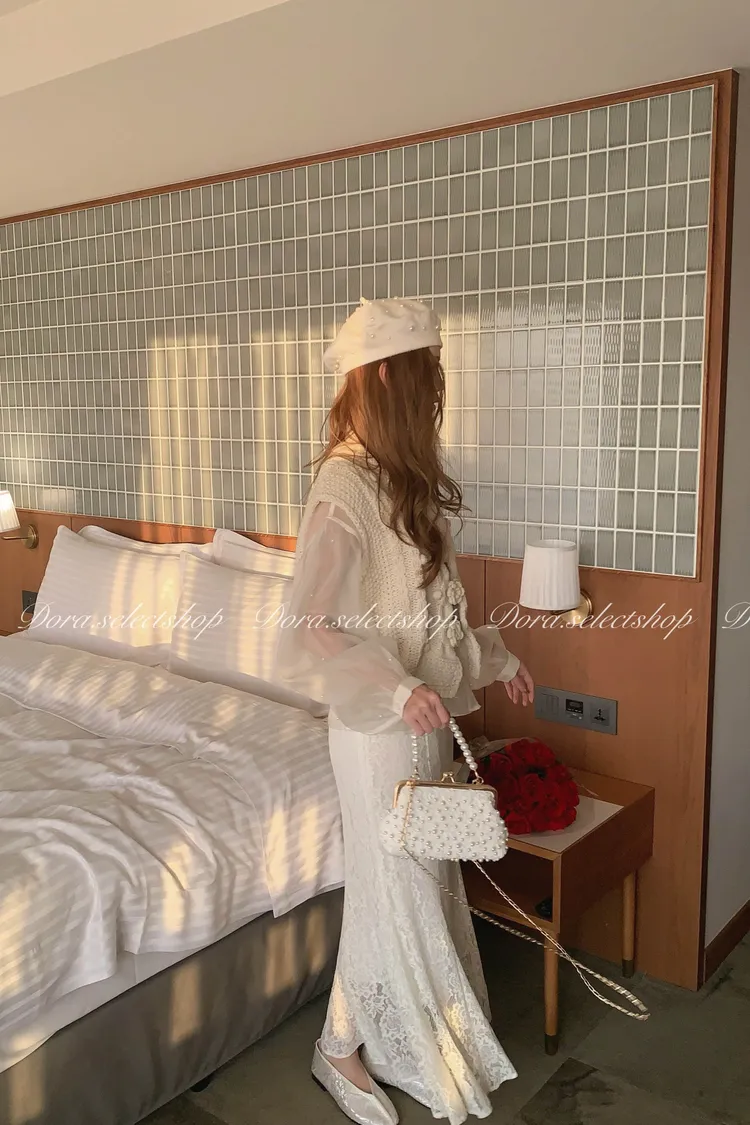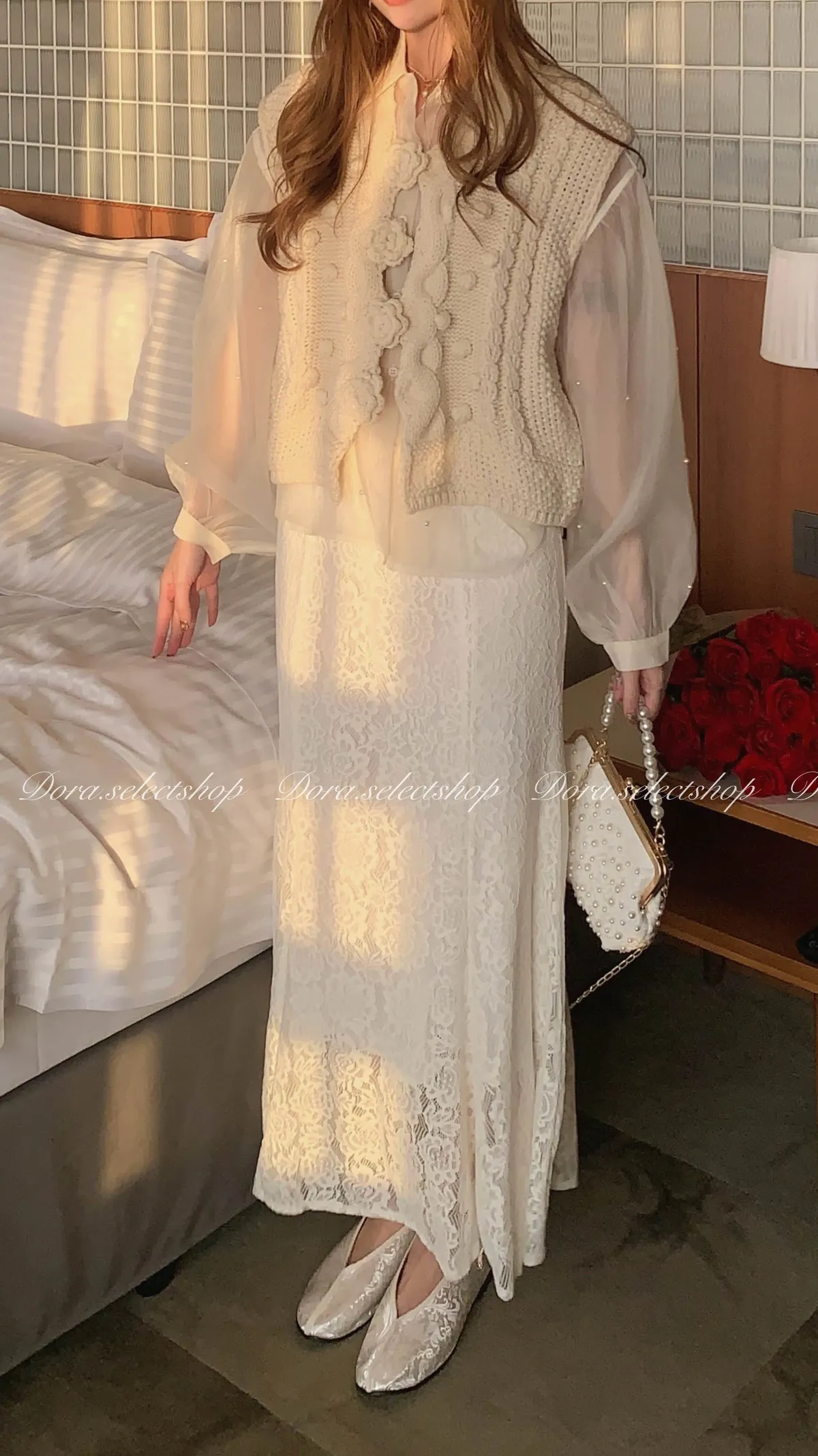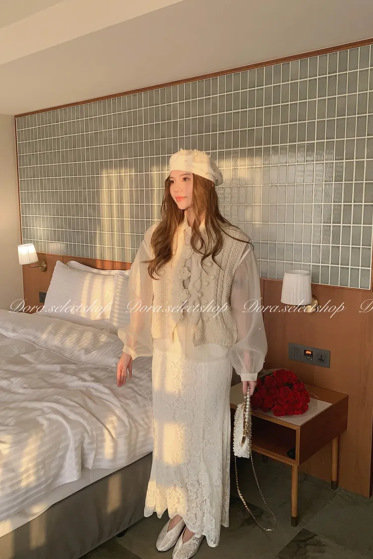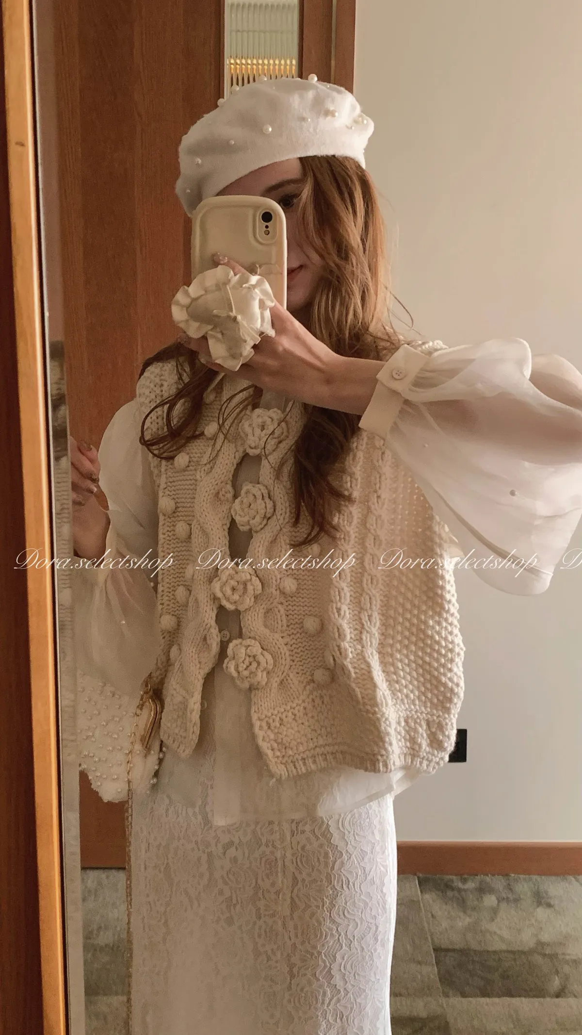 復古仙氣珍珠透肌澎袖襯衫---米白