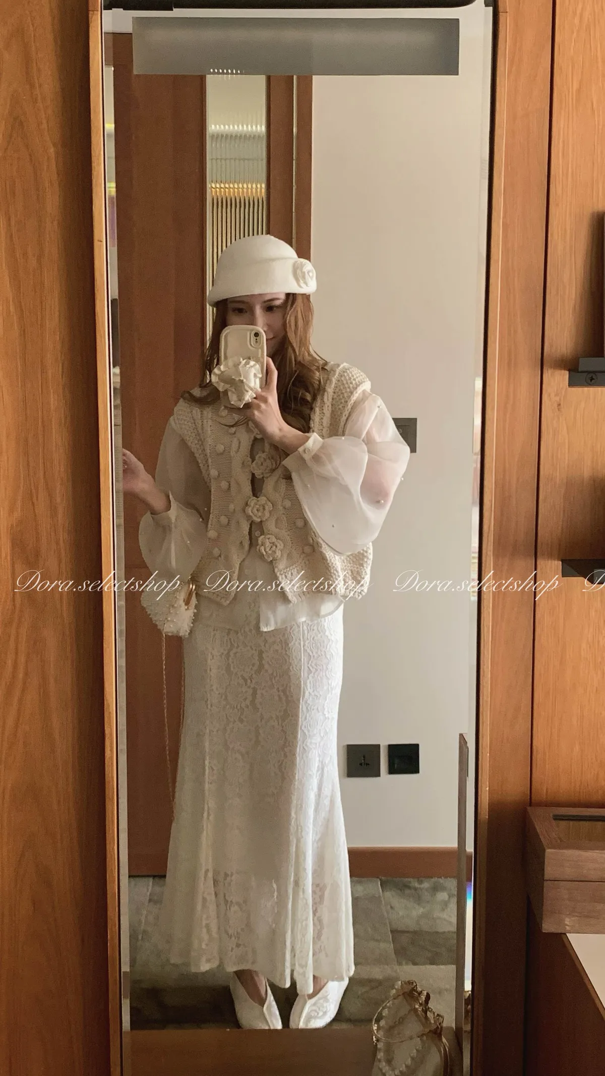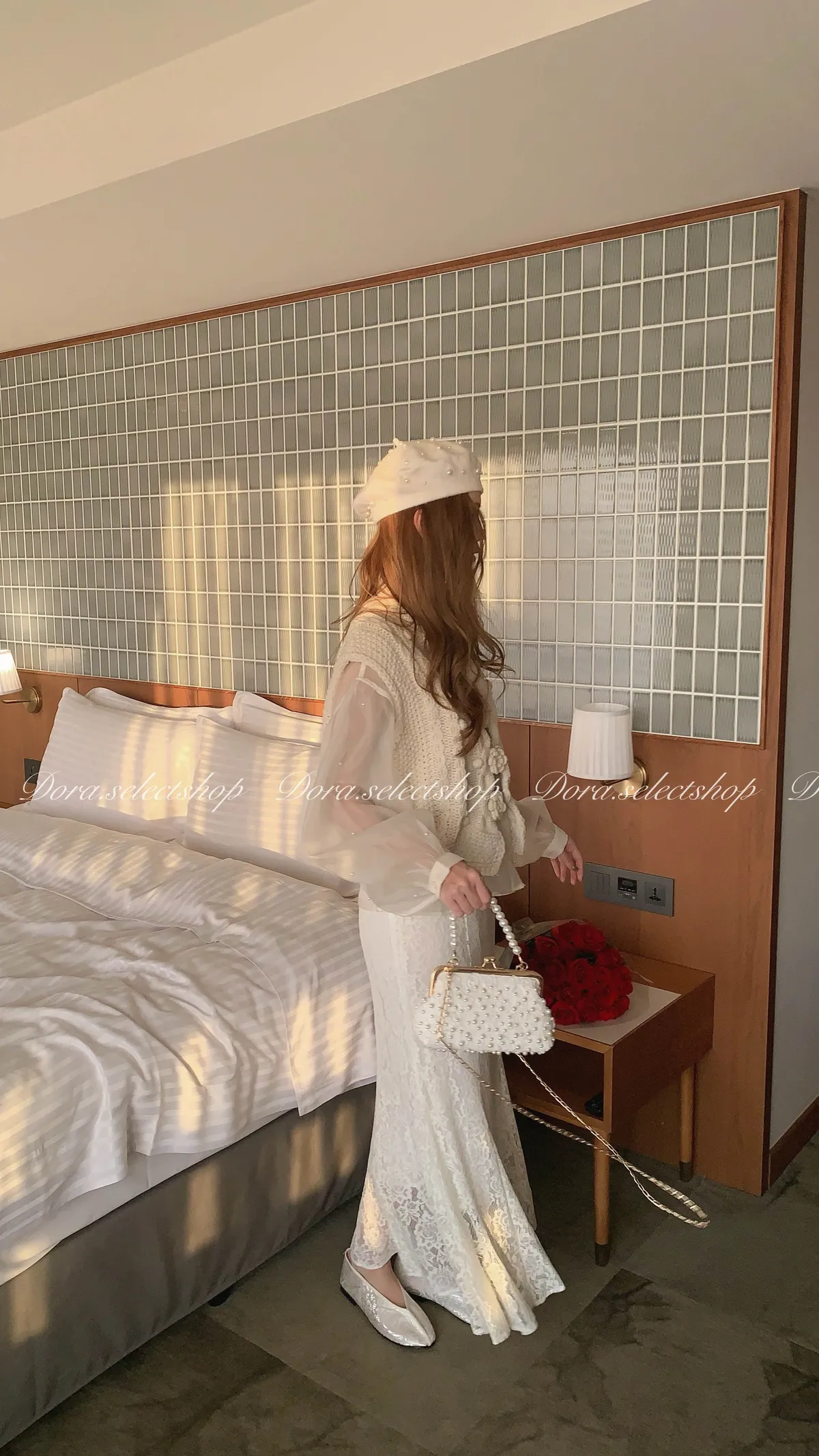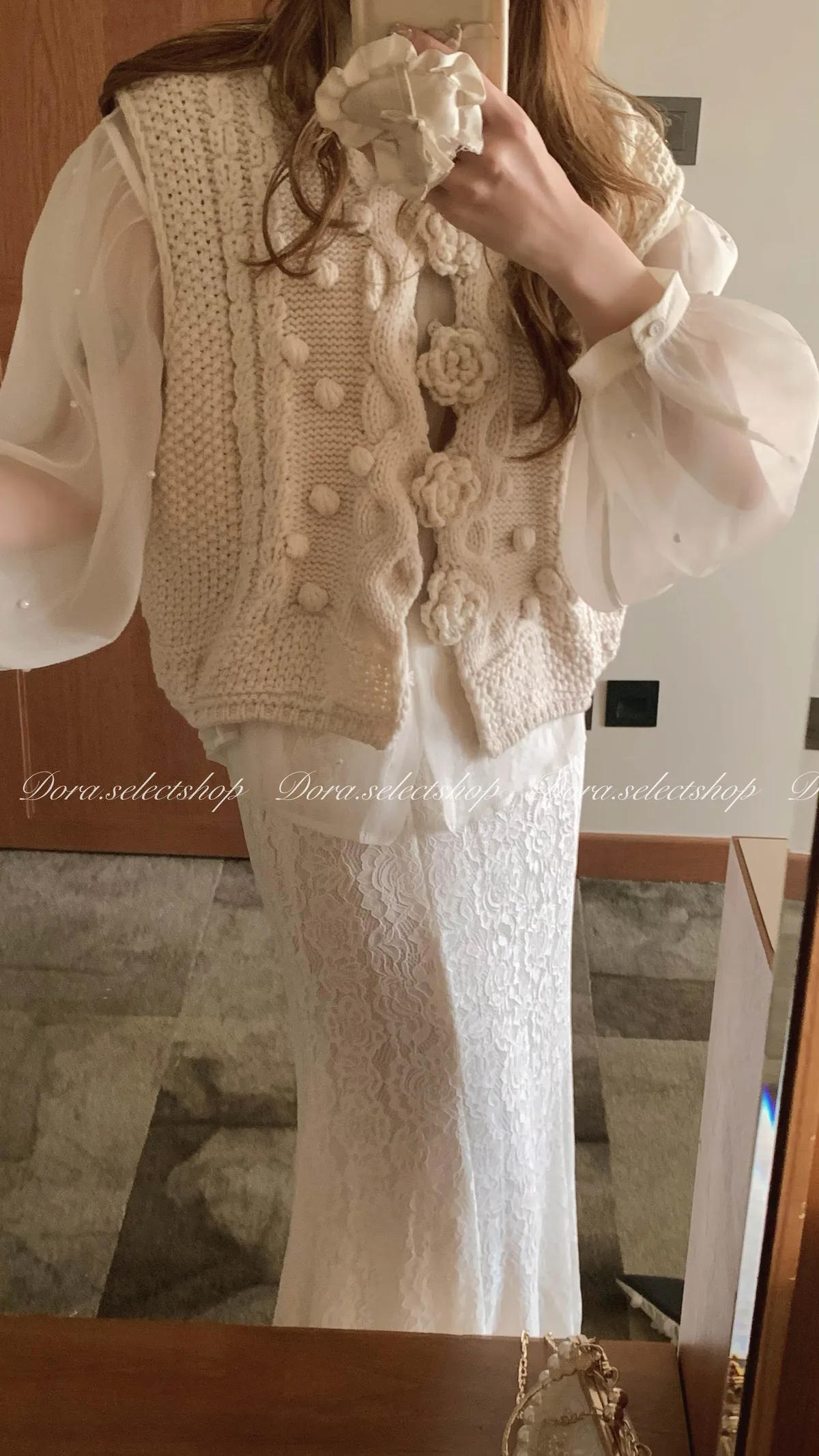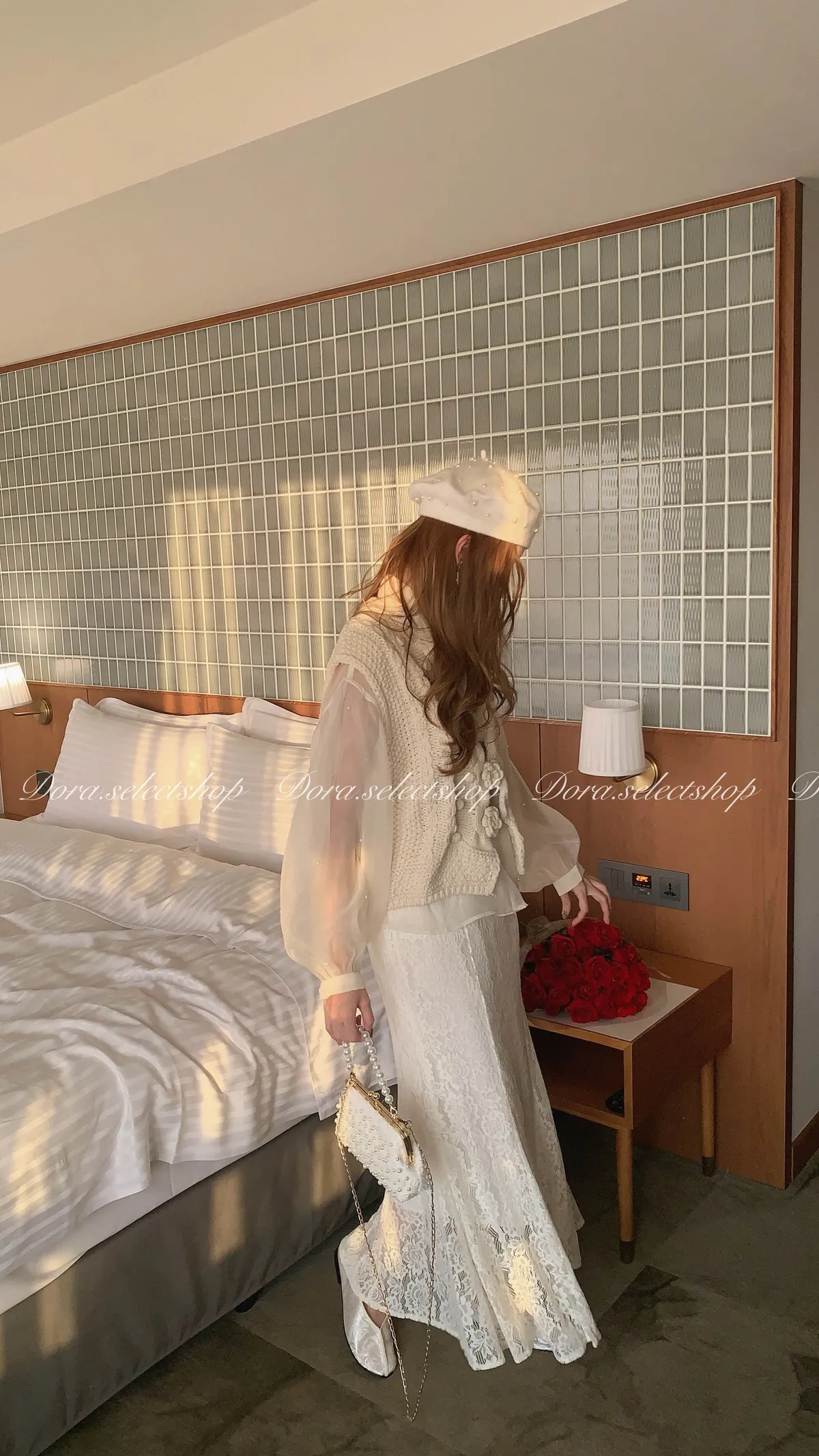 復古仙氣珍珠透肌澎袖襯衫---米白